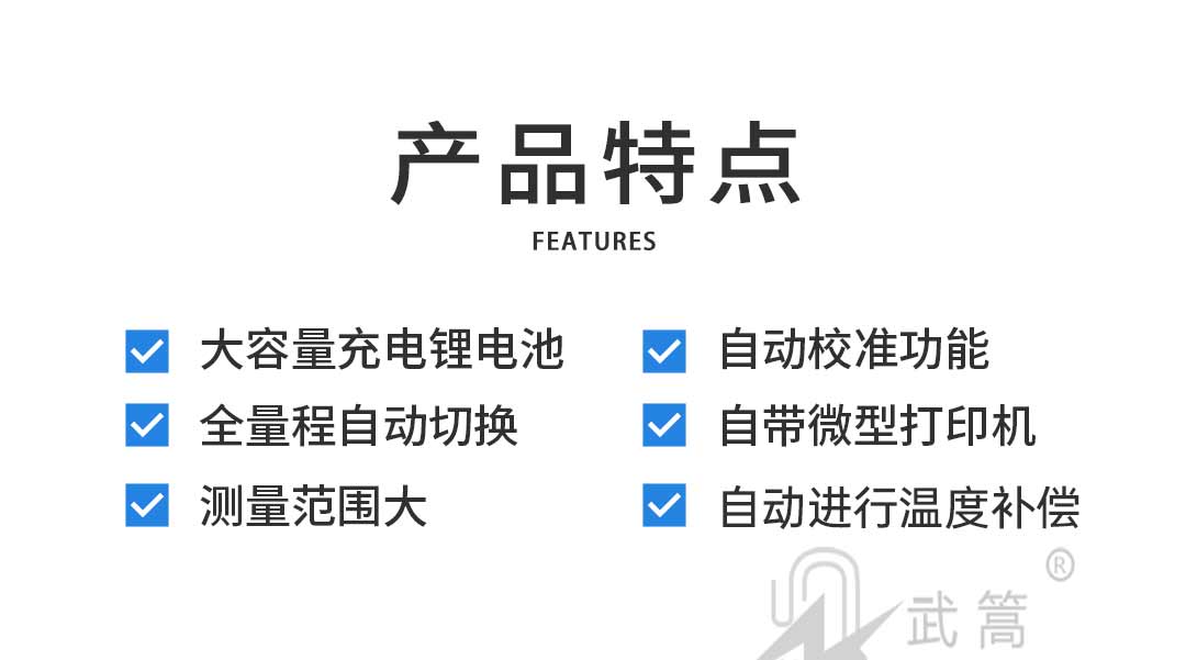 量程自動切換功能、 鹽密測量范圍大、自動進行溫度補償、儲存和打印功能、大容量充電鋰電池、自動帶電修正系數等。